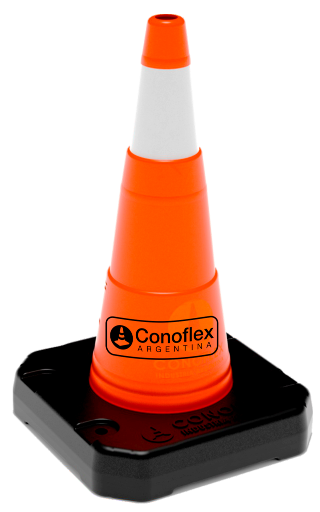 Cono de señalización vial de 50 cm de altura, fabricado en material polietileno semirrígido. Color naranja vial, con filtro UV para protección solar. Conformado en “2 piezas”, llamadas: Cono y Base de Contrapeso.