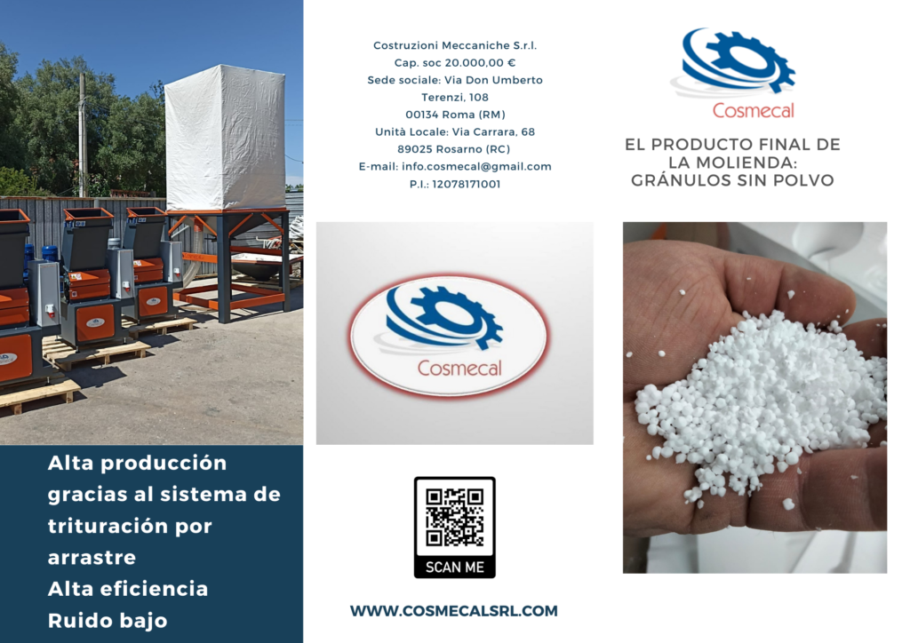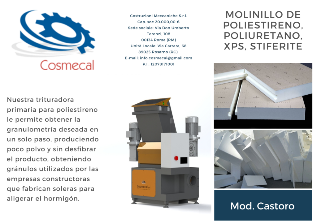 TRITURADORA PARA RESIDUOS DE POLIESTIRENO (EPS) Mod. CASTORO,TRITURADORA PARA ALIVIO DE SOLADOS DE HORMIGÓN – CELa maquina llamada molinillo mod. CASTORO ha sido diseñado paratriturar poliestireno expandido de corte o procesamiento de desechos devarias densidades y tamaños.El innovador sistema de trituración con baja emisión de ruidorepresenta una novedad en el sector, tanto que hace que la máquina seaparticularmente versátil para su uso en el lugar de trabajo, además decumplir con las normas de seguridad que exigen la reducción de lasemisiones de ruido en la fuente.La concepción innovadora y la simplicidad del mecanismo pueden permitirel uso de la configuración básica para que sea adecuado para su uso enmuchos campos para la trituración de materiales particularmentefriables con baja dureza.La máquina fue construida teniendo en cuenta los conceptosfundamentales necesarios para las plantas modernas: confiabilidad,robustez, seguridad del operador, protección ambiental y modularidad.Nuestra trituradora primaria para poliestireno le permite obtener lagranulometría deseada en un solo paso, produciendo poco polvo y sindesfibrar el producto, obteniendo gránulos utilizados por las empresasconstructoras que fabrican soleras para aligerar el hormigón.Los gránulos también se utilizan para soplar techos y rellenar pufs.