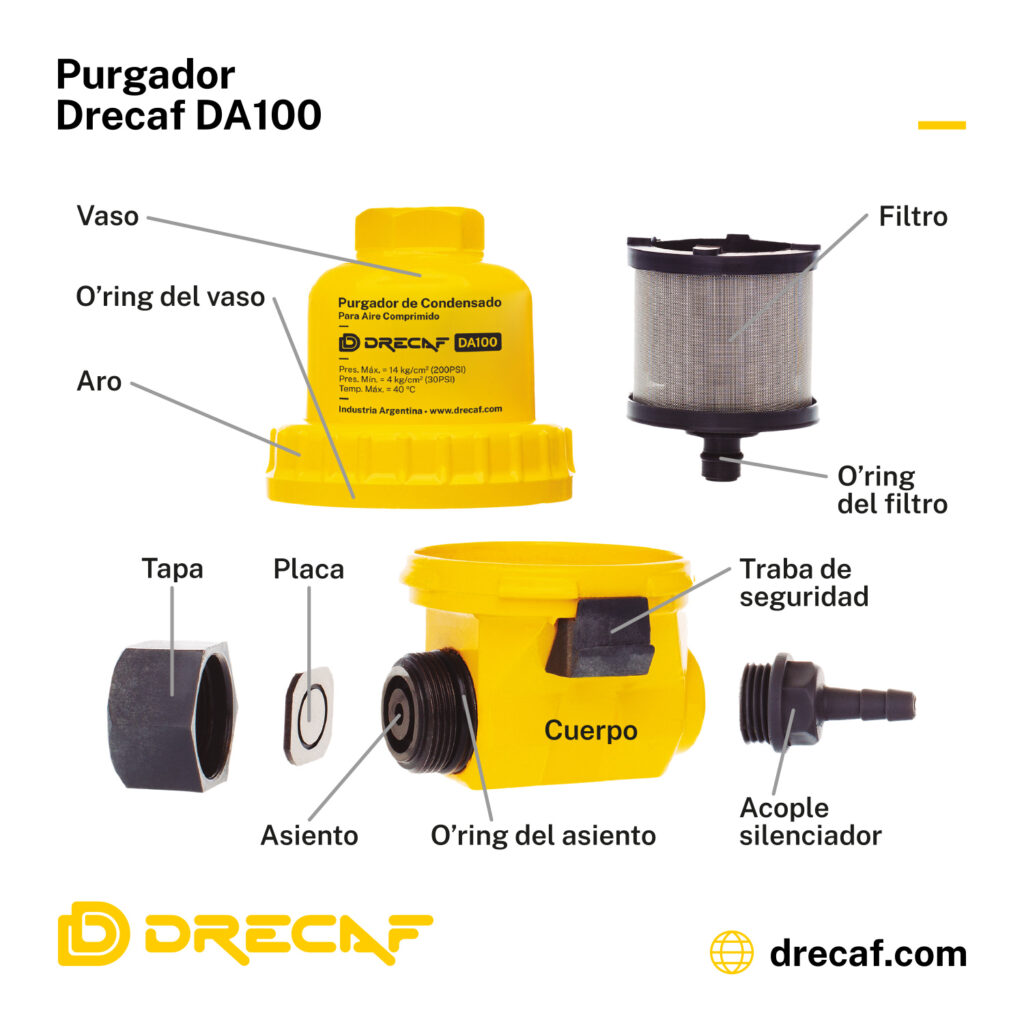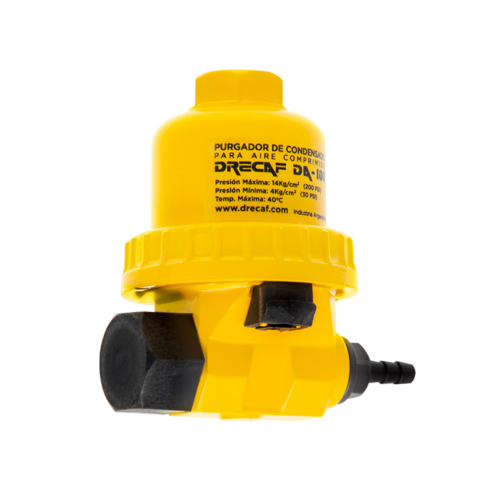 El purgador Drecaf DA100 actúa eficazmente donde se acumule condensado, drenando inmediatamente el contaminante del sistema.