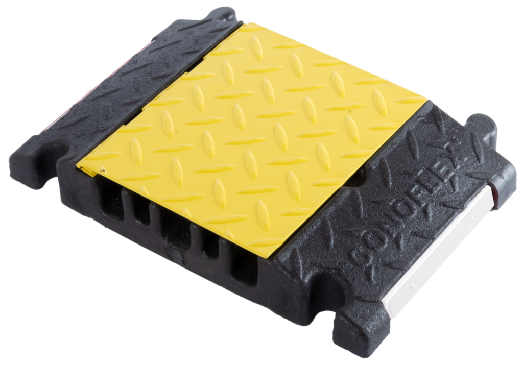 Reductor de velocidad, fabricado con material PVC flexible macizo de dureza 90 shore A, cada módulo es de color negro y adjuntado a él, una tapa metálica amarilla con bisagras de sujeción.
