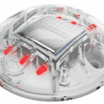 Tacha lumínica de carga solar, fabricada en policarbonato cristal. Está provista con fotocélula para encendido automático, 3 leds por lado, un microprocesador, memorias RAM, ROM y EPROM, así también con diferentes entradas y salidas digitales y analógicas, todo en un mismo encapsulado.