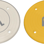 Su diámetro es de 12 cm y una altura de 0,6 cm. Cuenta con 3 orificios para fijación con anclaje mecánico al suelo, se recomienda la utilización de adhesivo poliuretánico para mejorar su adherencia al suelo. Diseño de logo o señal a elección. Grabado en color gris.