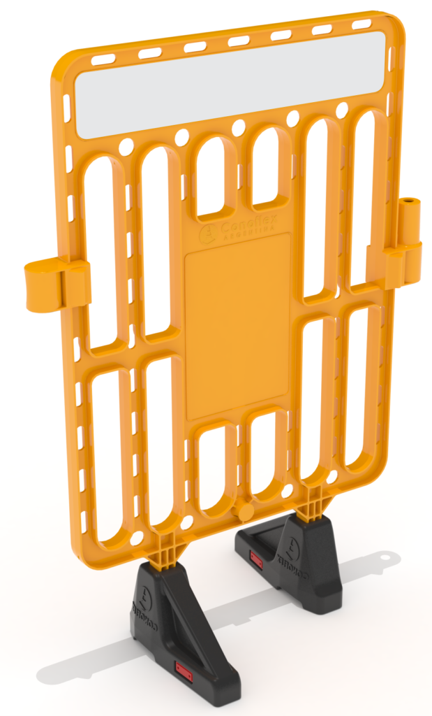 Valla plástica para seguridad vial, fabricada en material polietileno de media densidad, con filtro UV para protección solar. Está conformada en “3 piezas”, llamadas: Valla y Bases de Contrapeso.